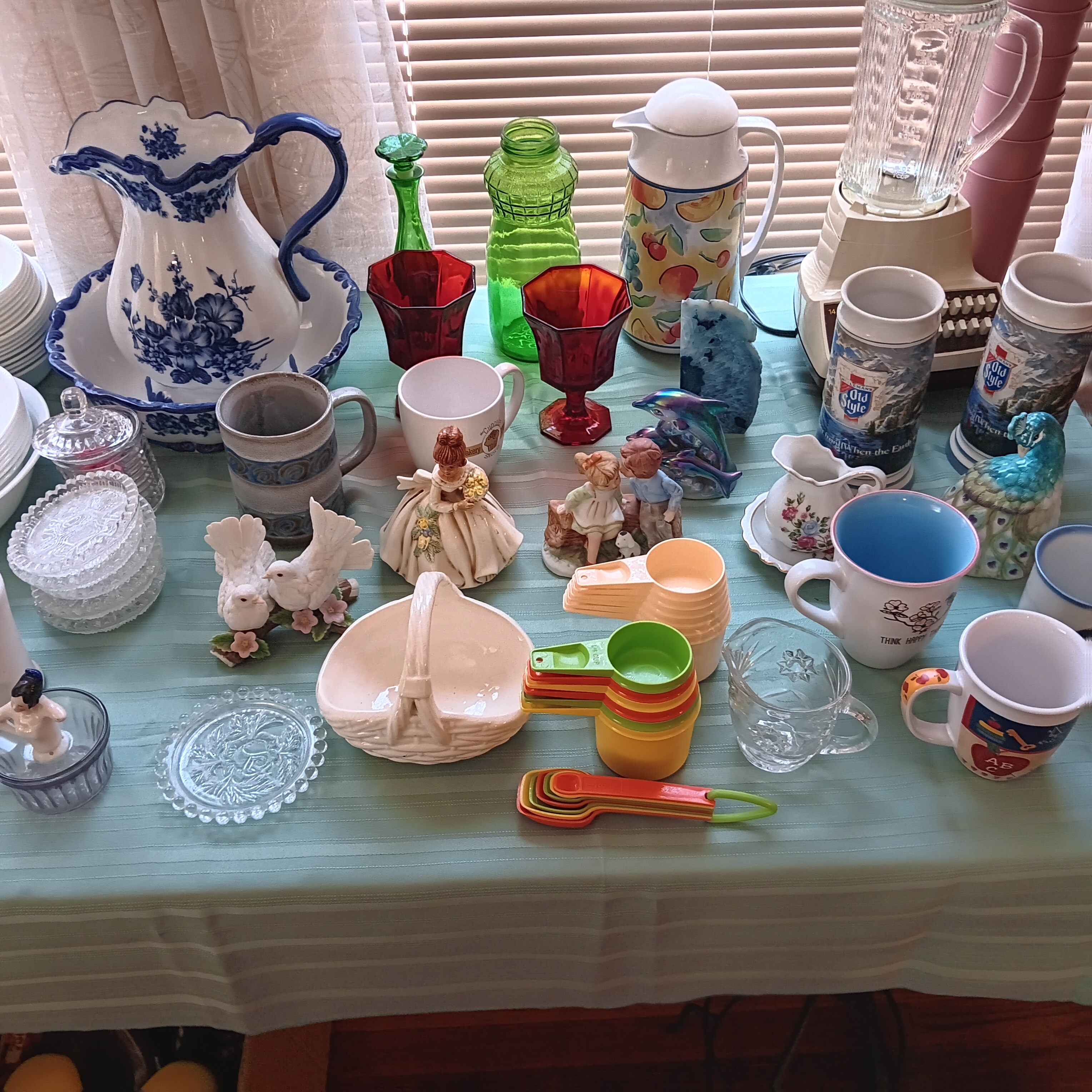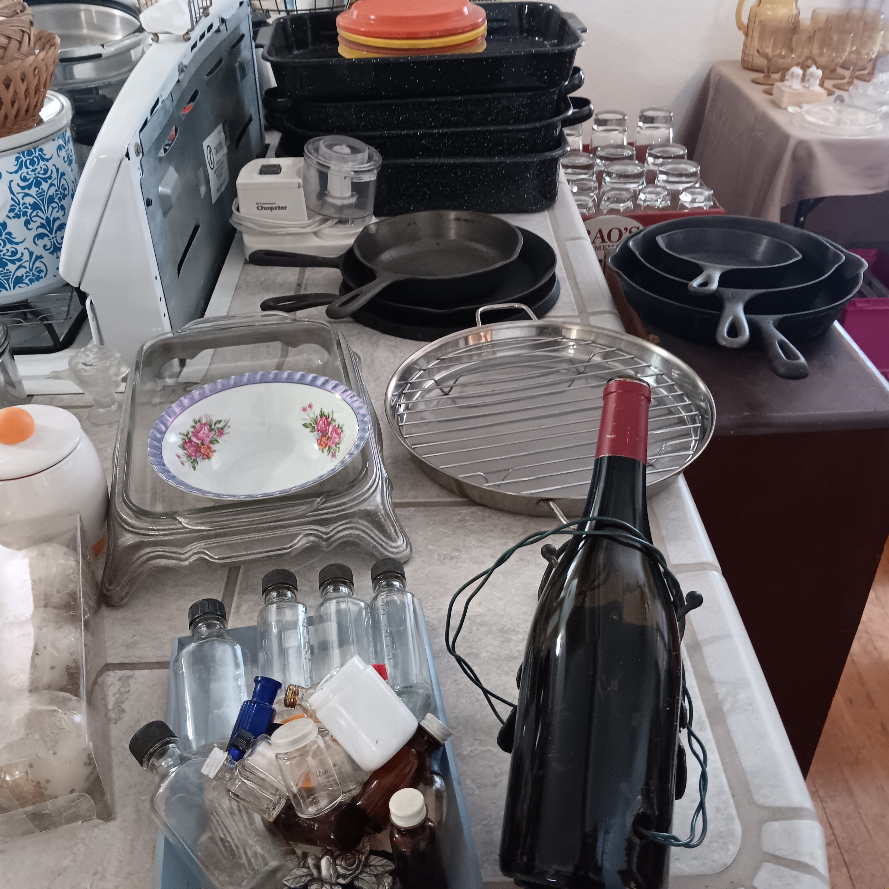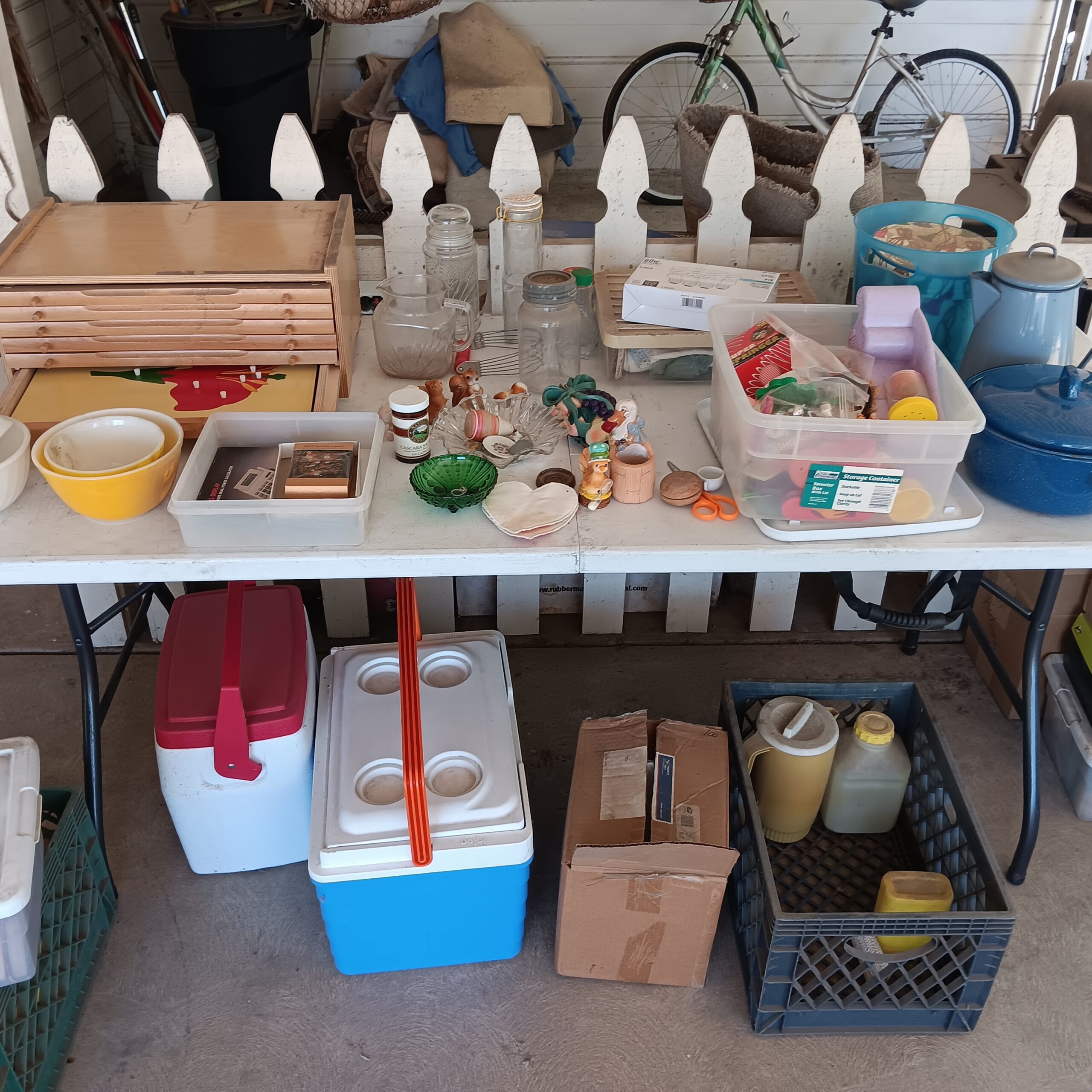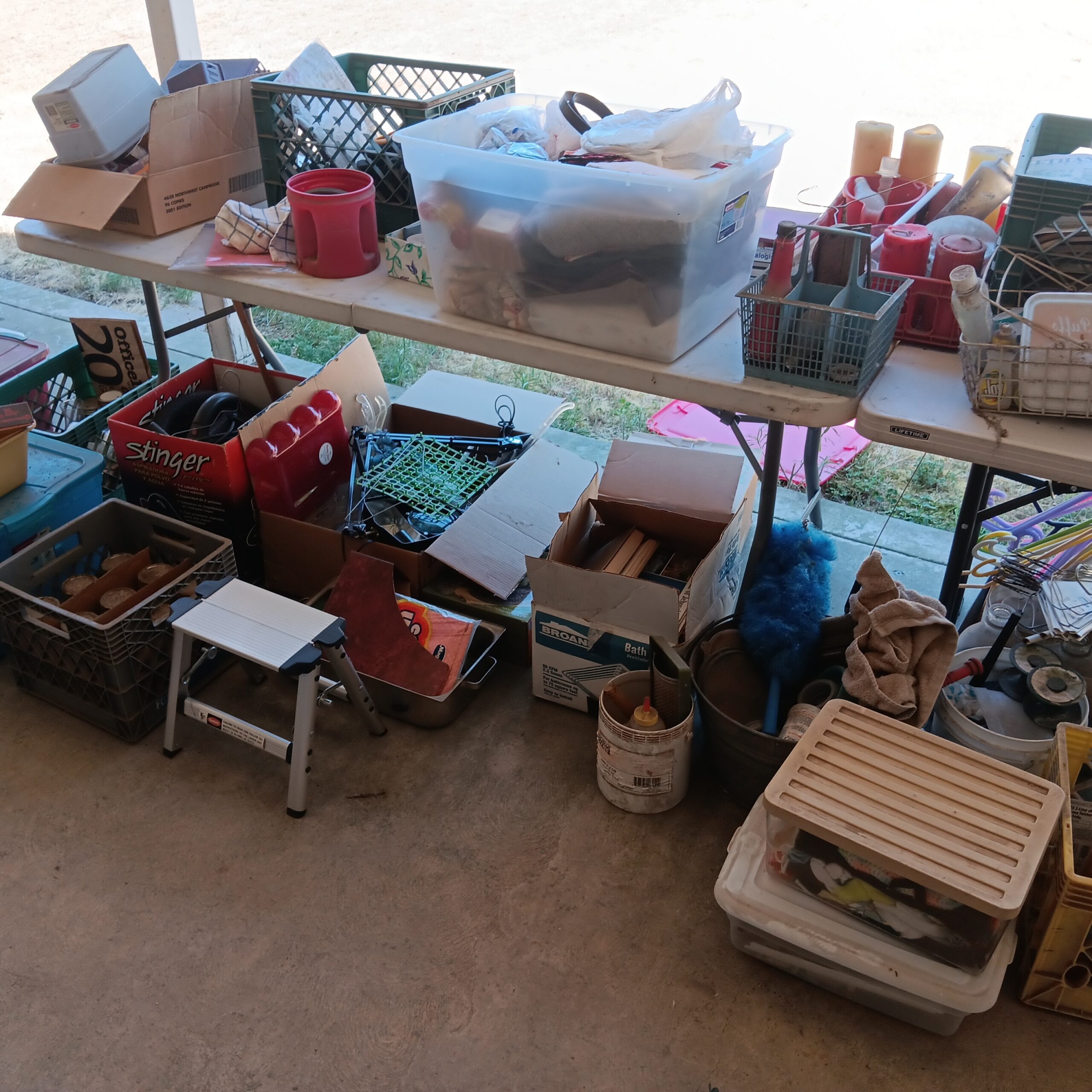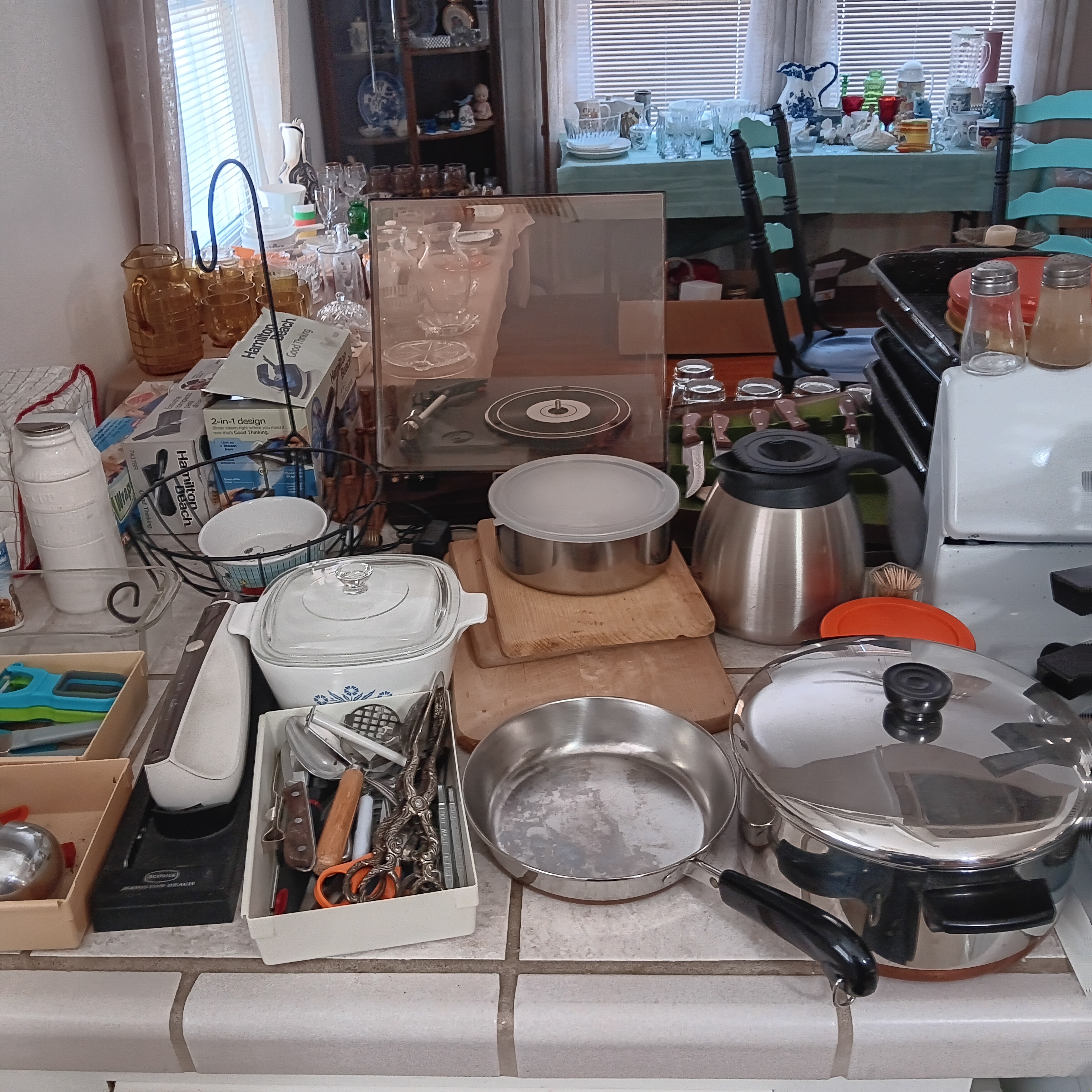 Tools, records, record players, plumbing, vintage lamps, furniture, household décor, vintage Tupperware, Pyrex, record cabinet, hand crank singer, men’s clothing, Honda mower, edger, vintage bicycles, an abundance of craft supplies, office supplies, quilts, Kirby vacuum, canning jars galore, washer/dryer ( electric), Revere pots and pans, cast iron, air compressor, like new bed we only just moved outside.