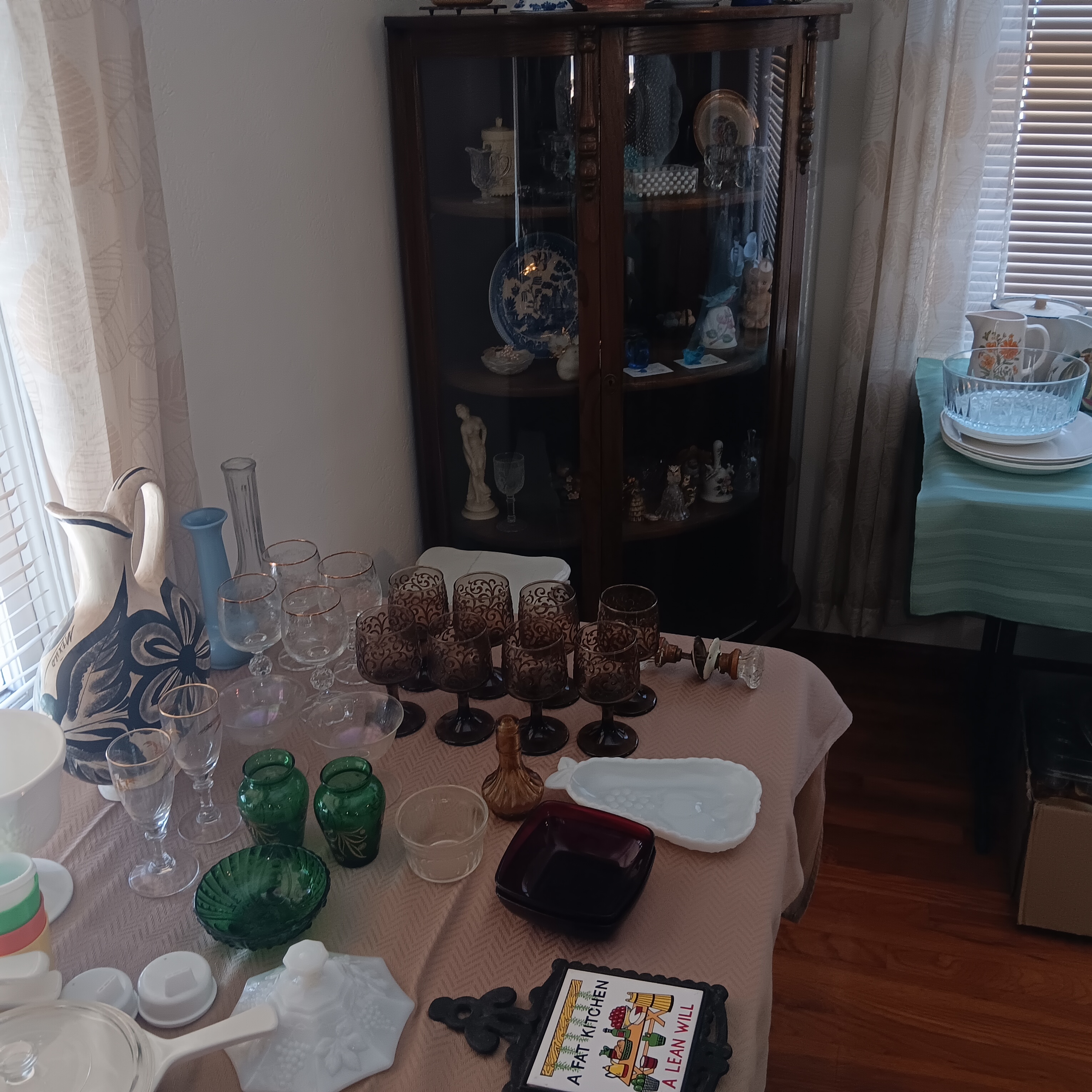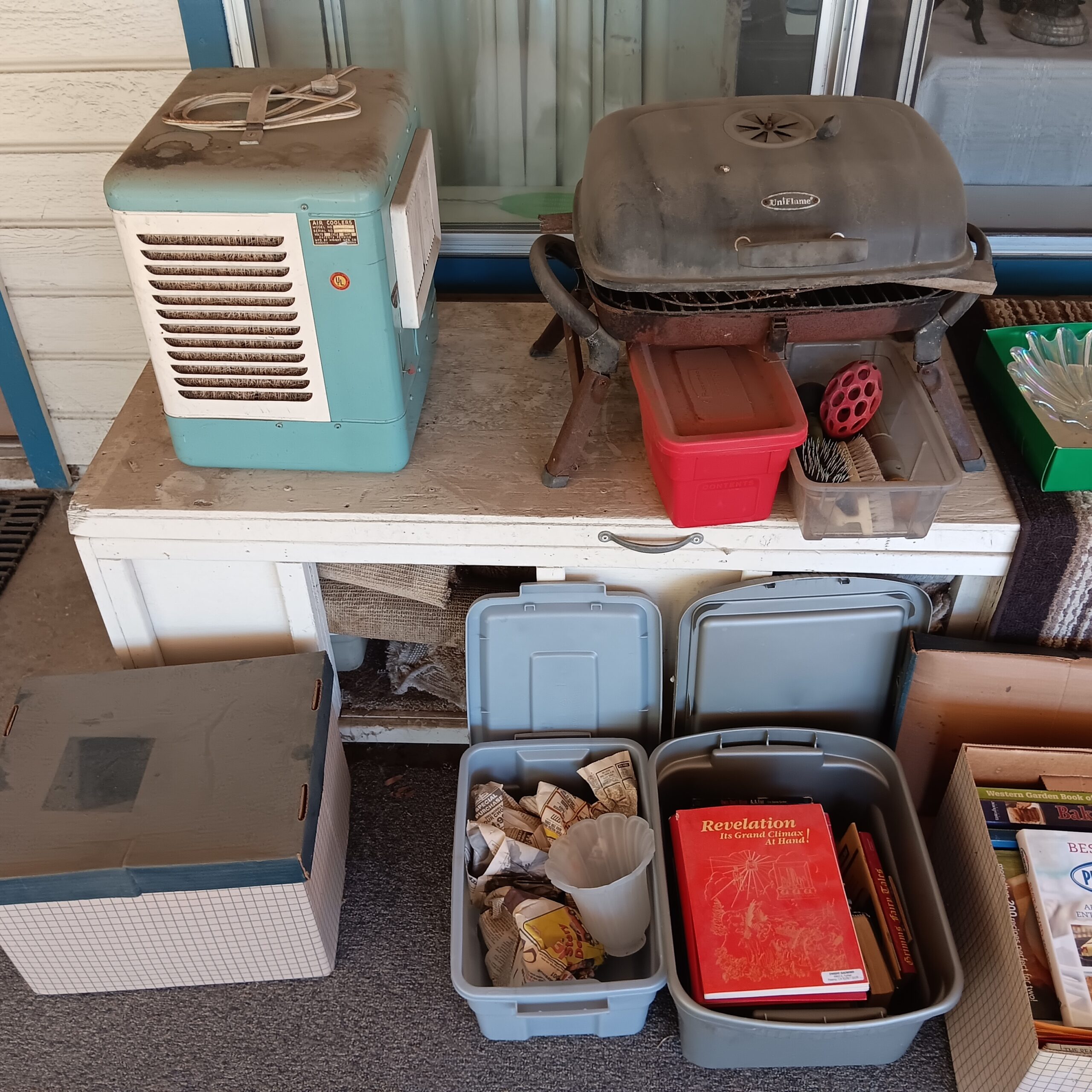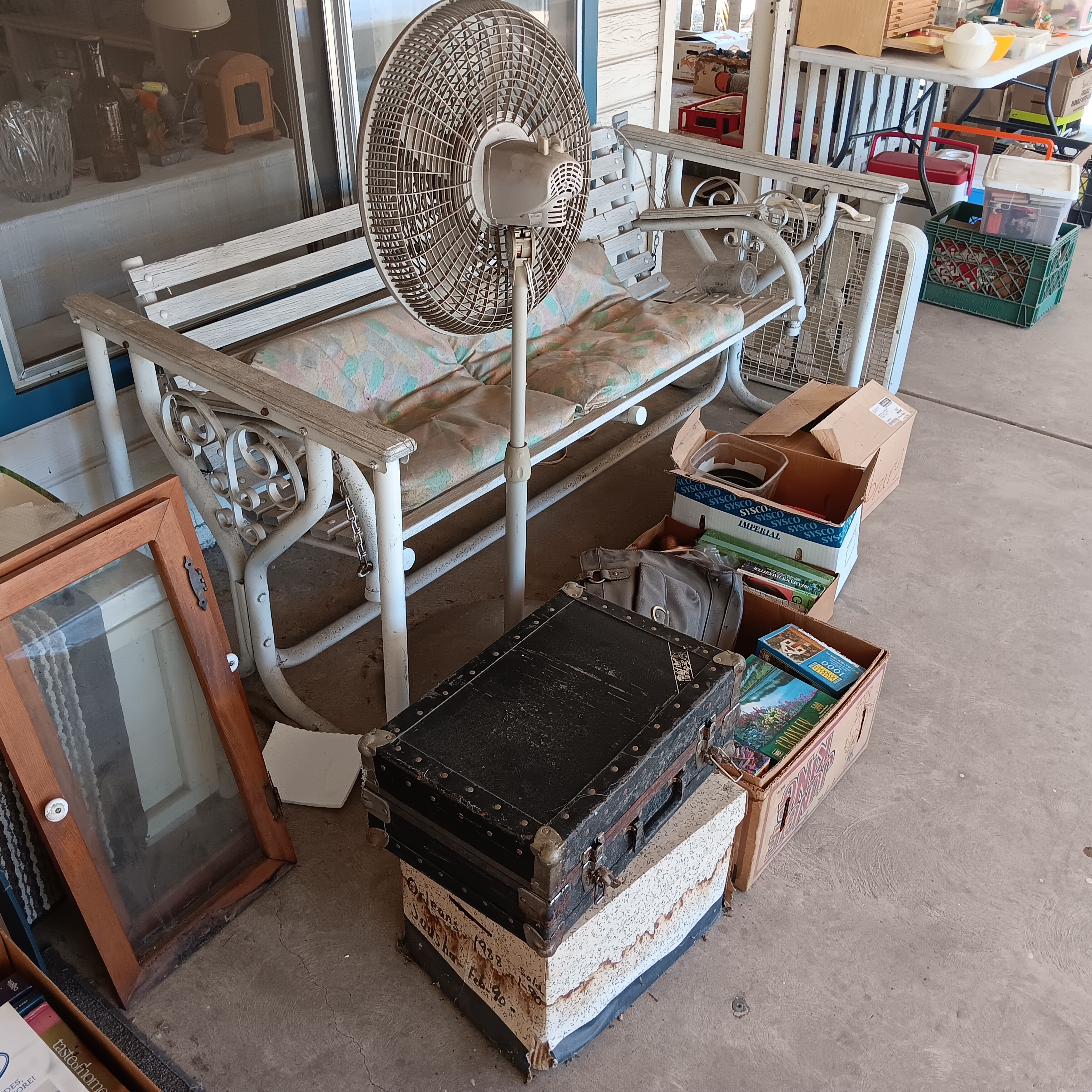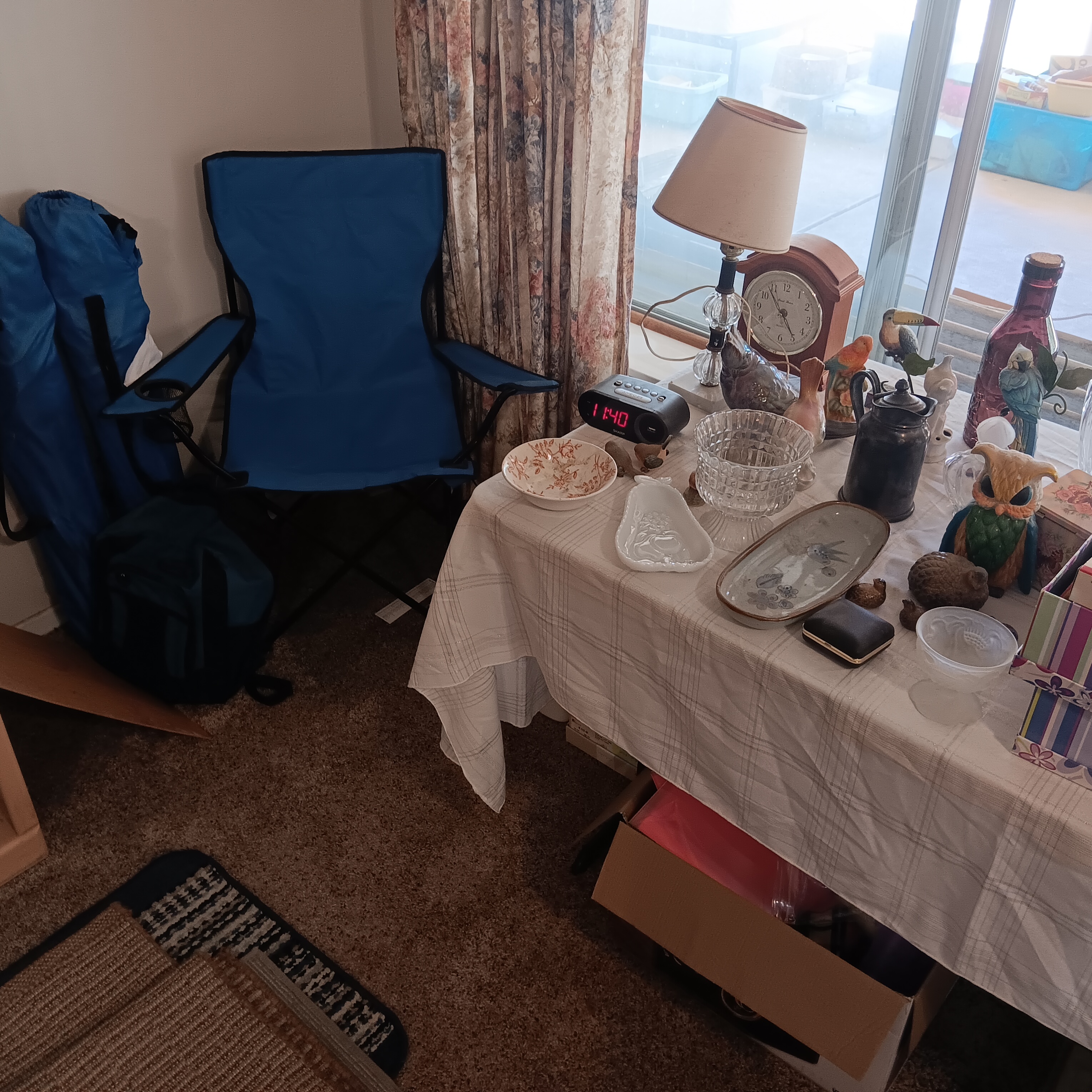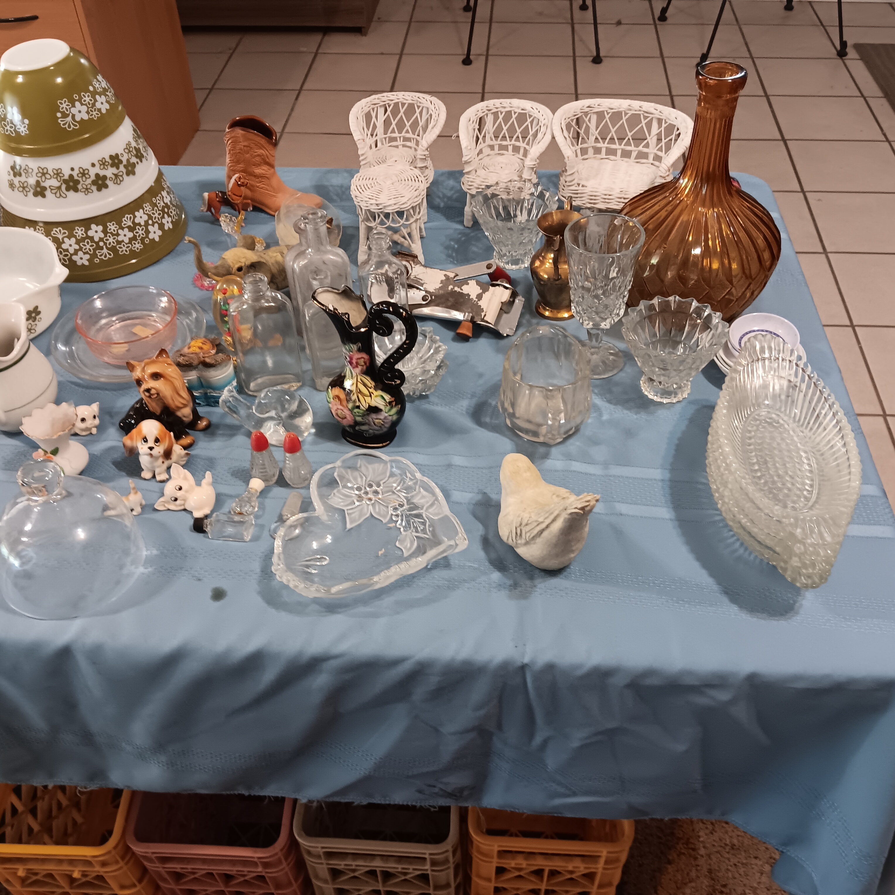 Tools, records, record players, plumbing, vintage lamps, furniture, household décor, vintage Tupperware, Pyrex, record cabinet, hand crank singer, men’s clothing, Honda mower, edger, vintage bicycles, an abundance of craft supplies, office supplies, quilts, Kirby vacuum, canning jars galore, washer/dryer ( electric), Revere pots and pans, cast iron, air compressor, like new bed we only just moved outside.