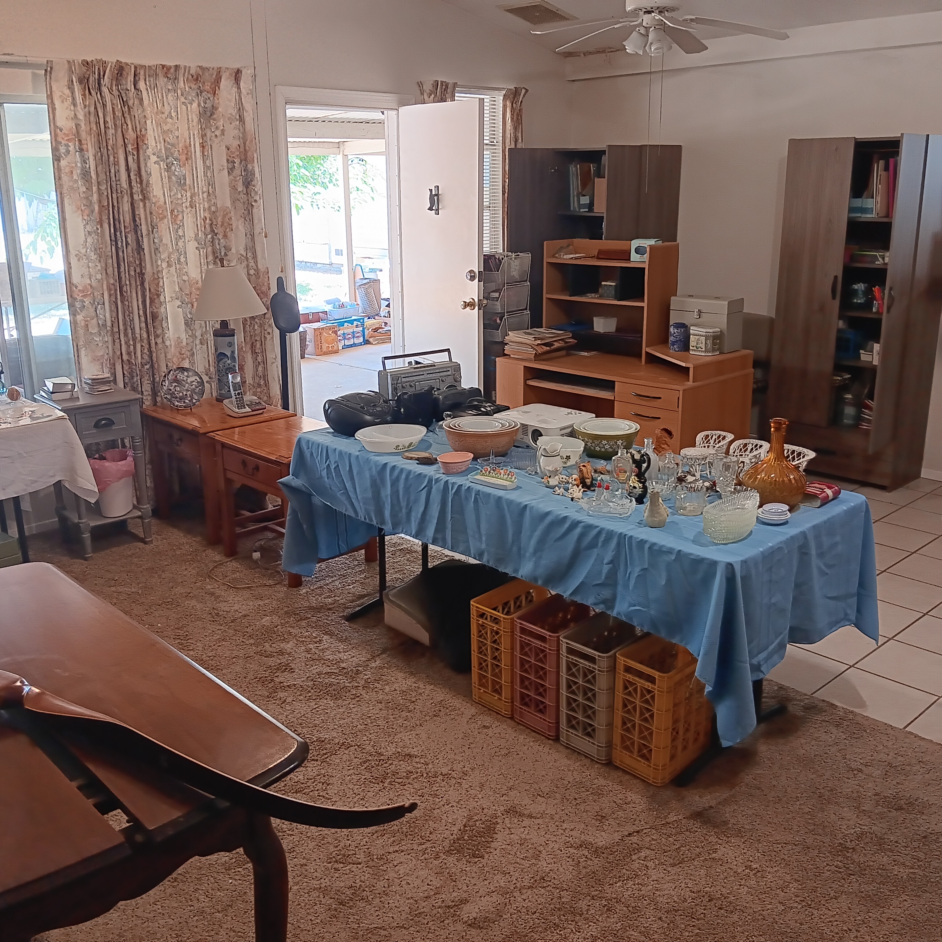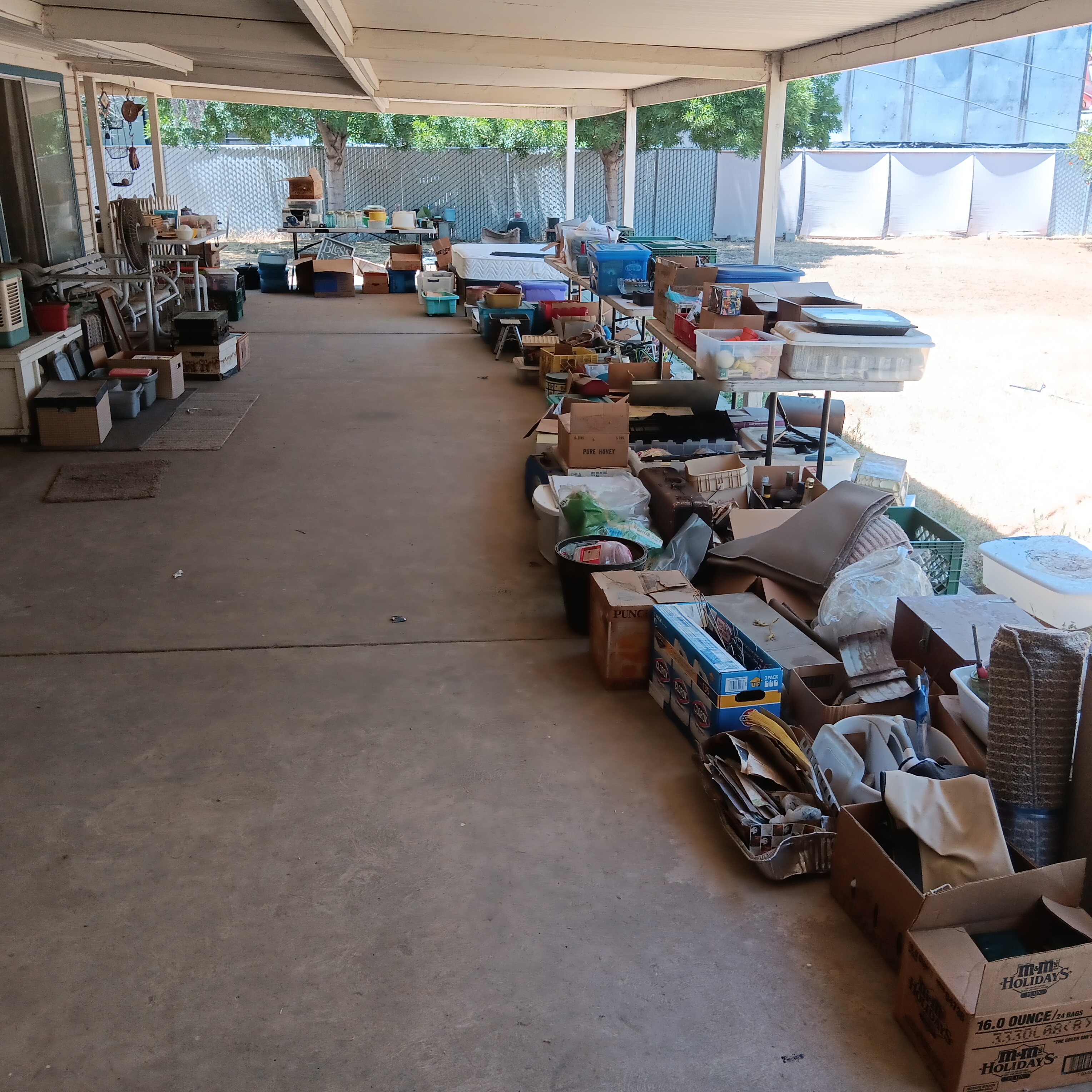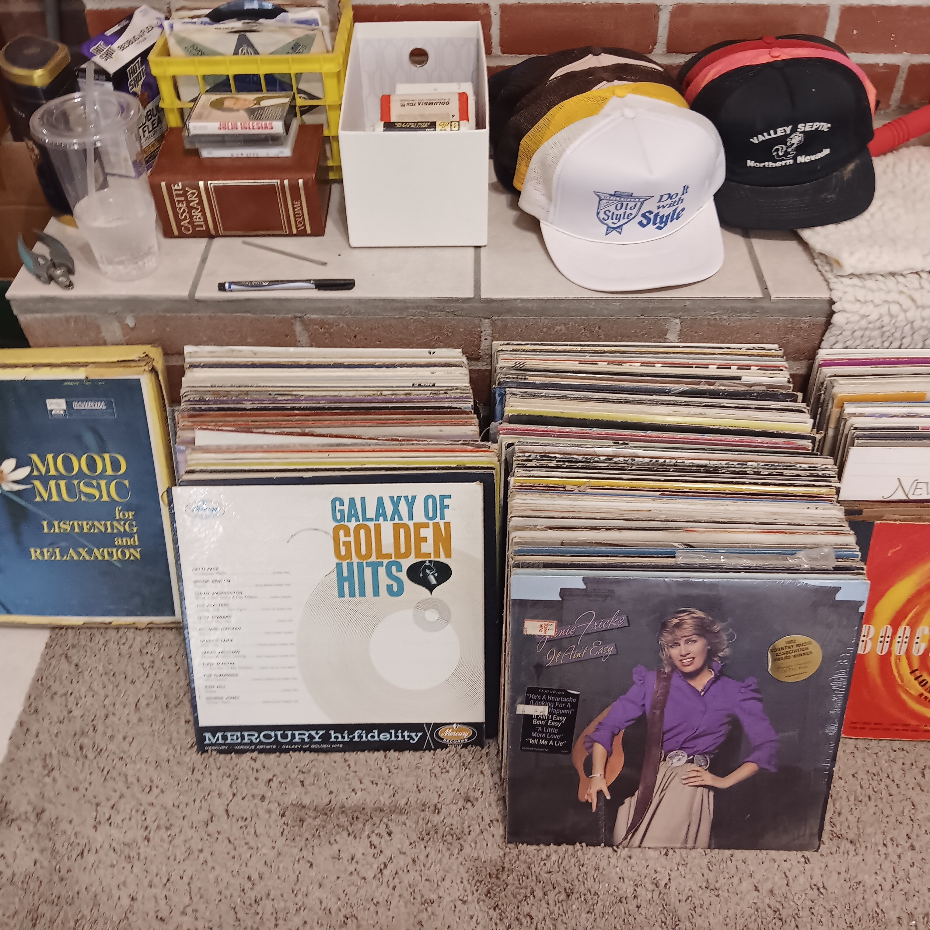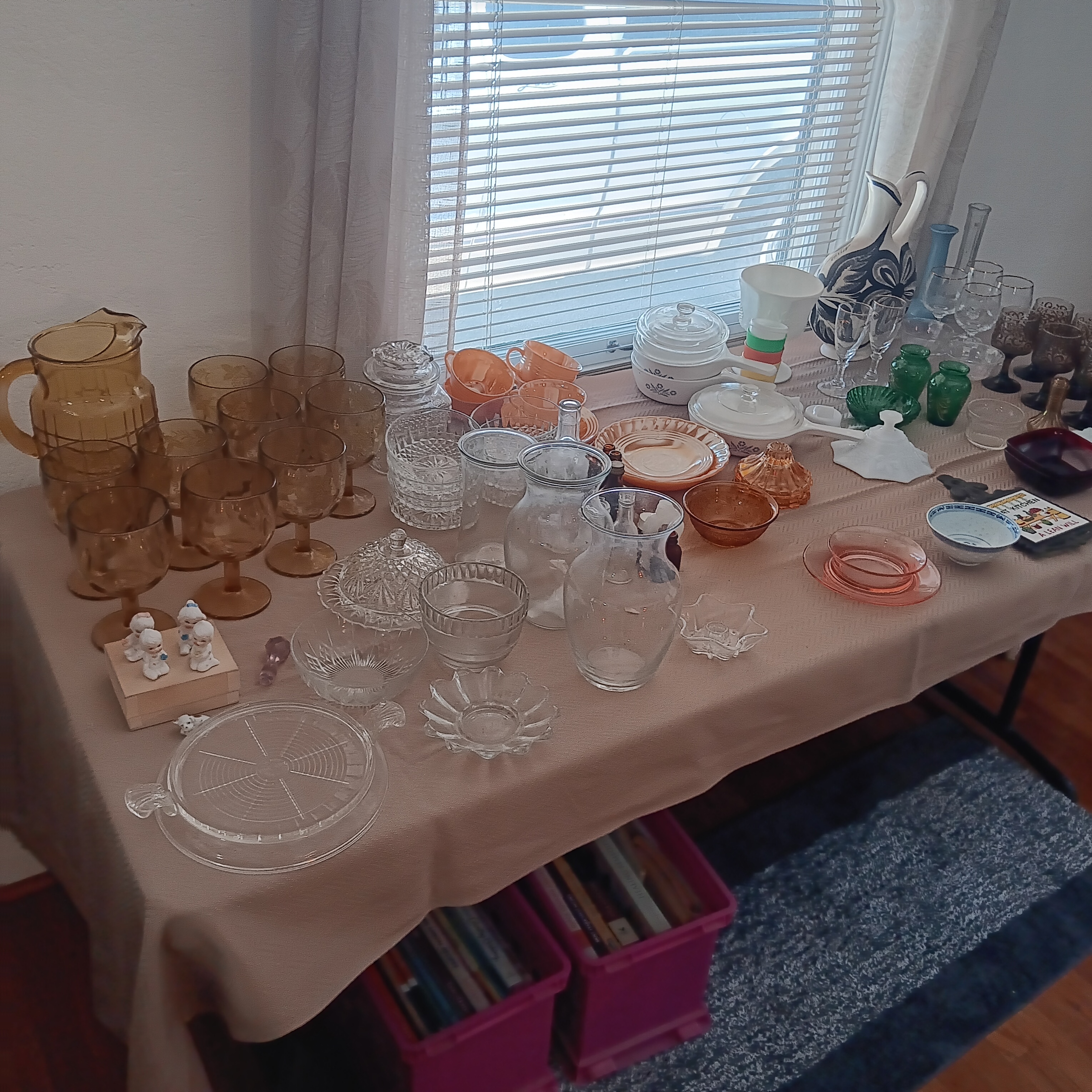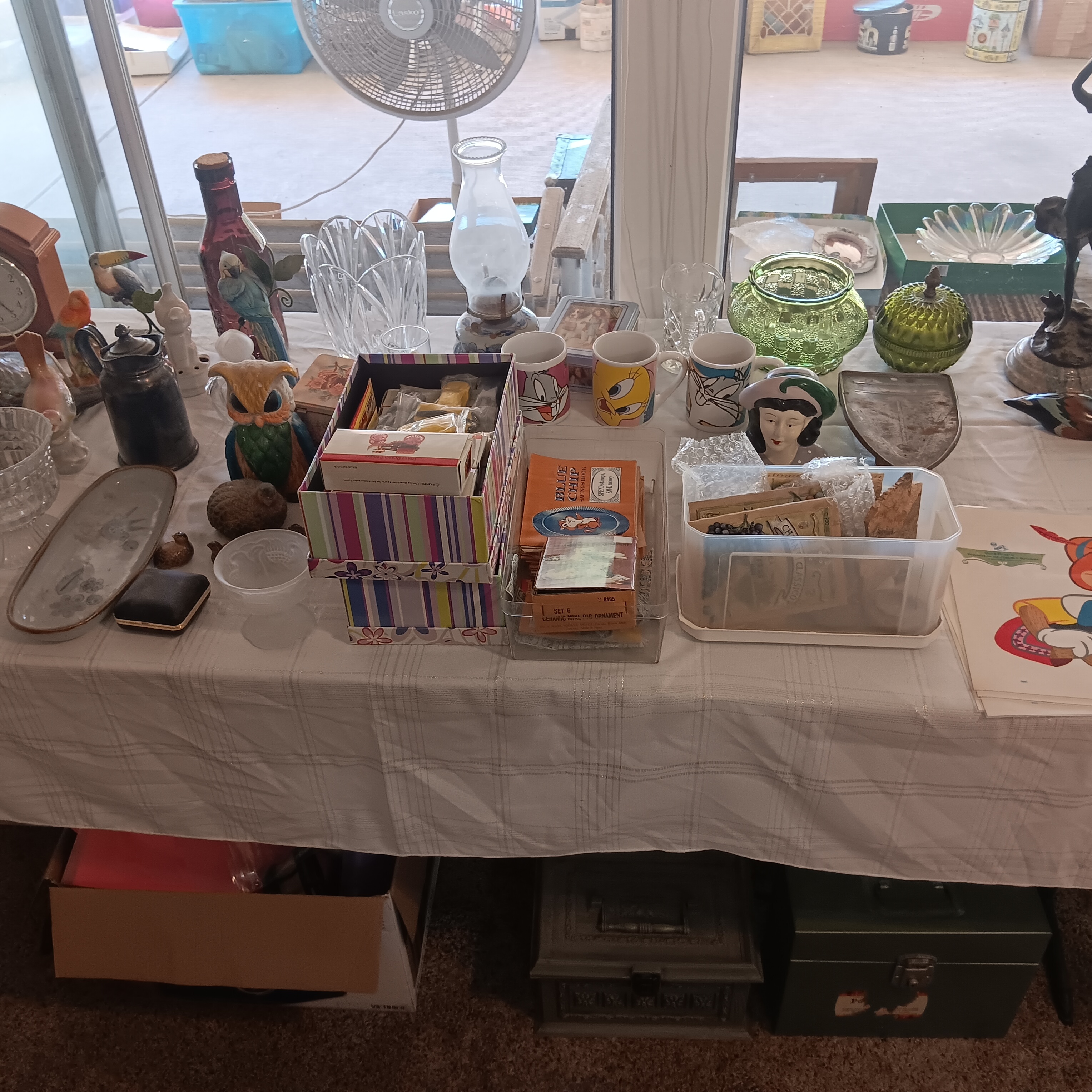 Tools, records, record players, plumbing, vintage lamps, furniture, household décor, vintage Tupperware, Pyrex, record cabinet, hand crank singer, men’s clothing, Honda mower, edger, vintage bicycles, an abundance of craft supplies, office supplies, quilts, Kirby vacuum, canning jars galore, washer/dryer ( electric), Revere pots and pans, cast iron, air compressor, like new bed we only just moved outside.