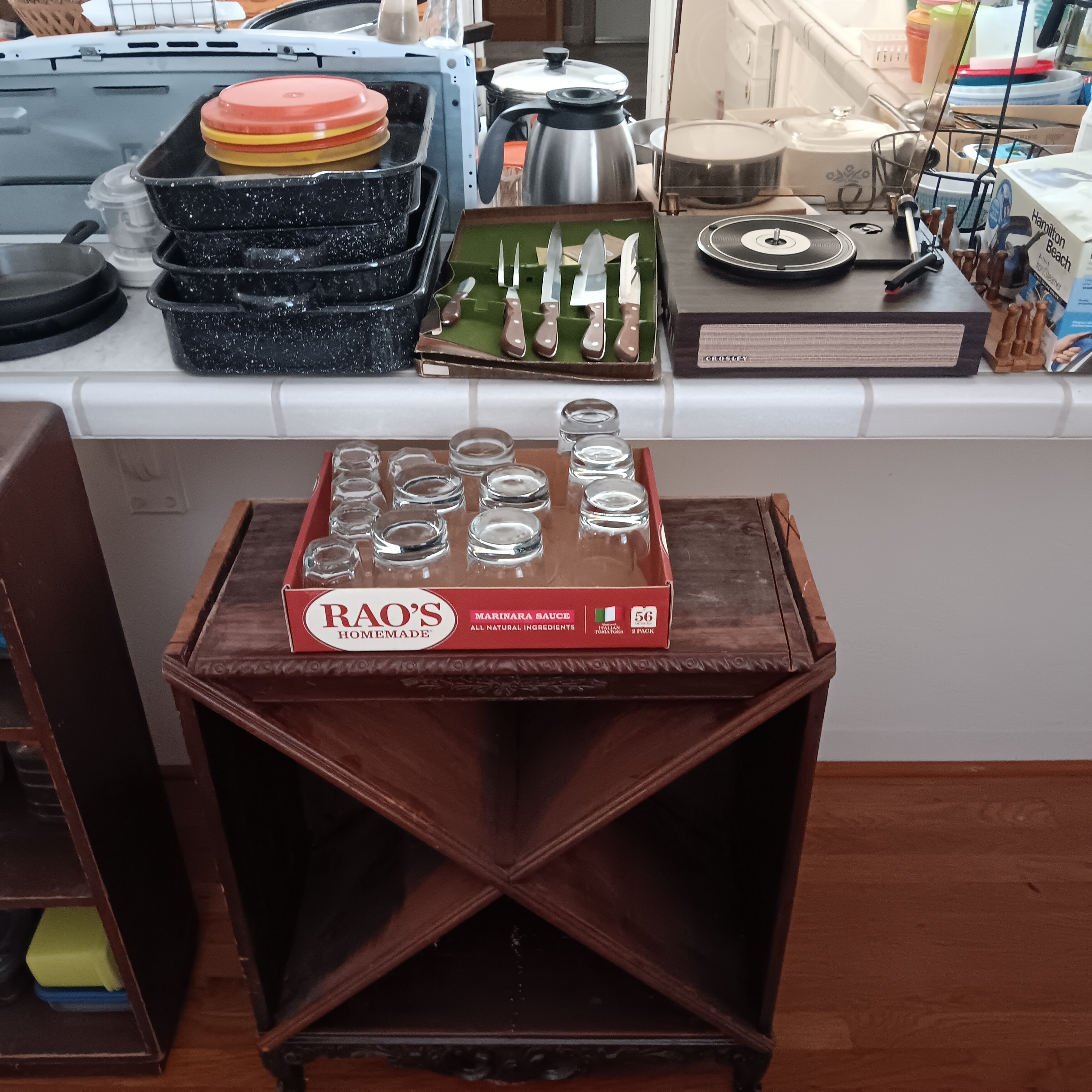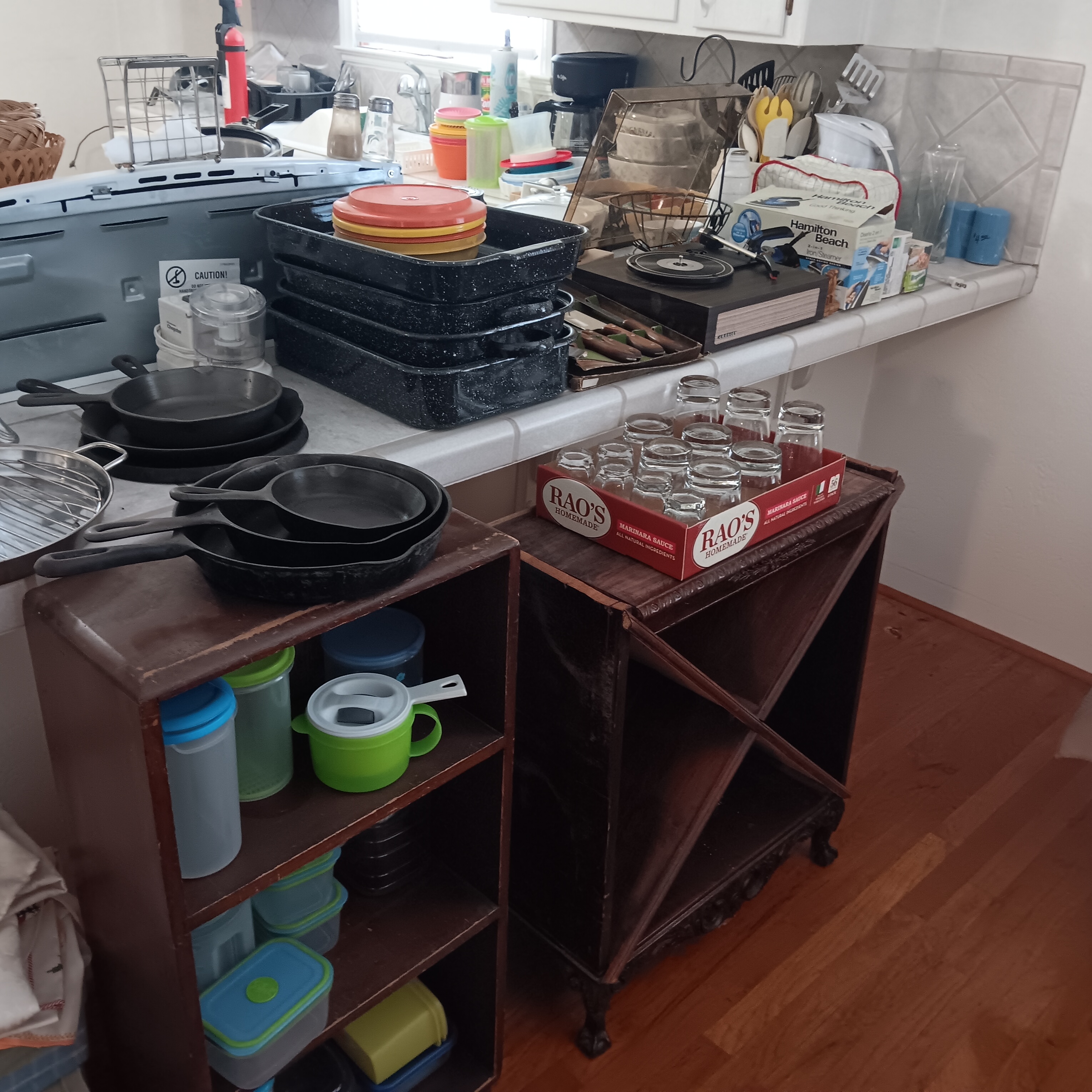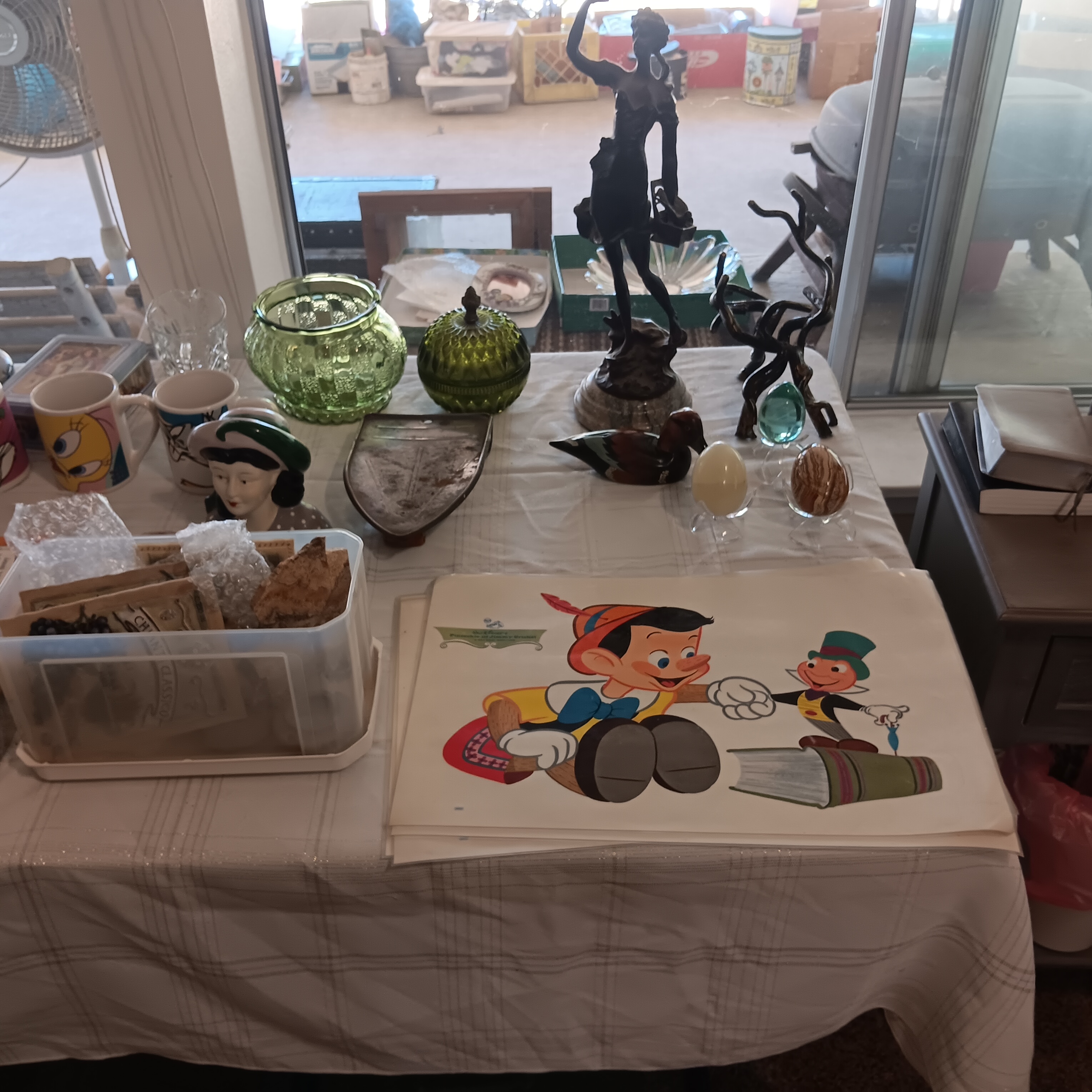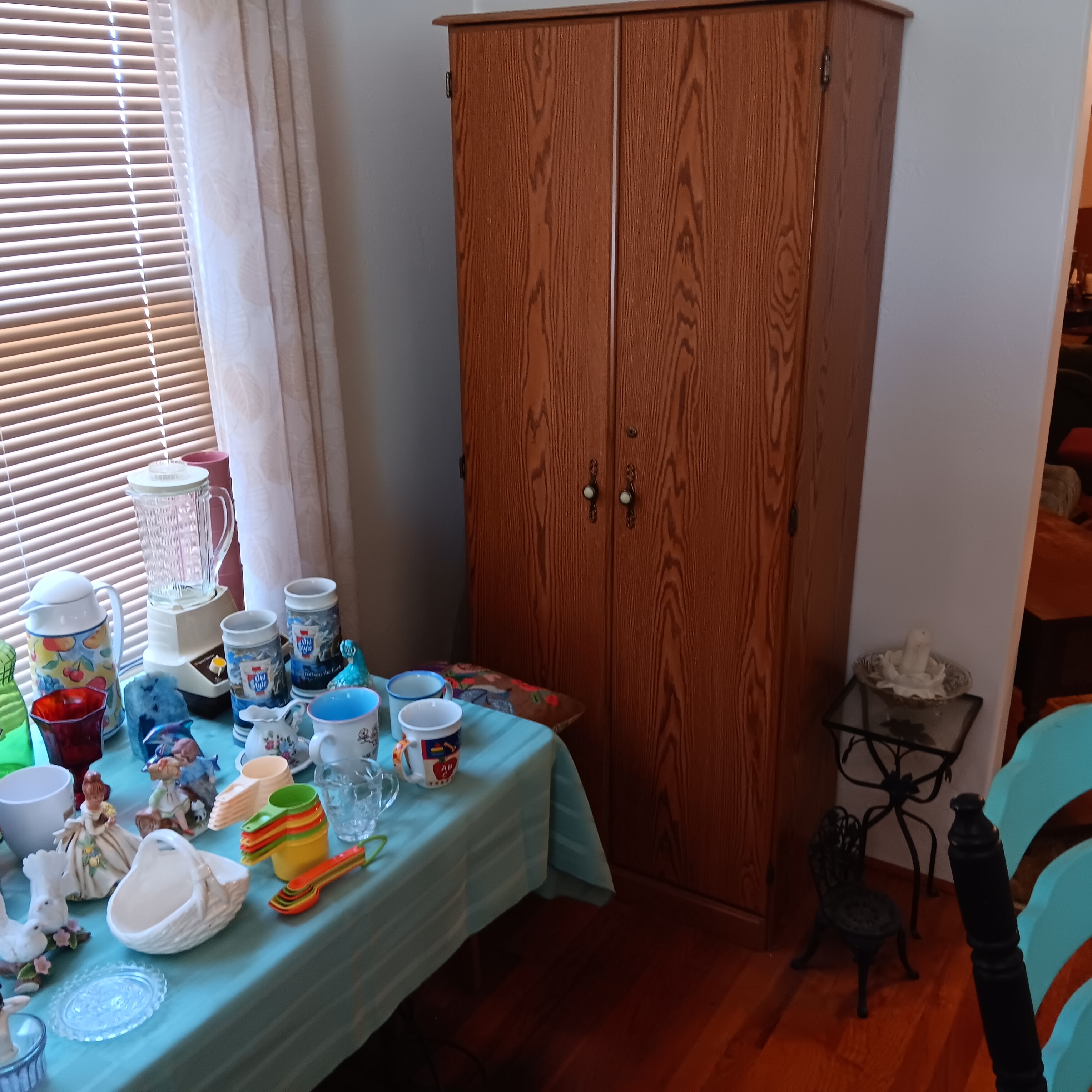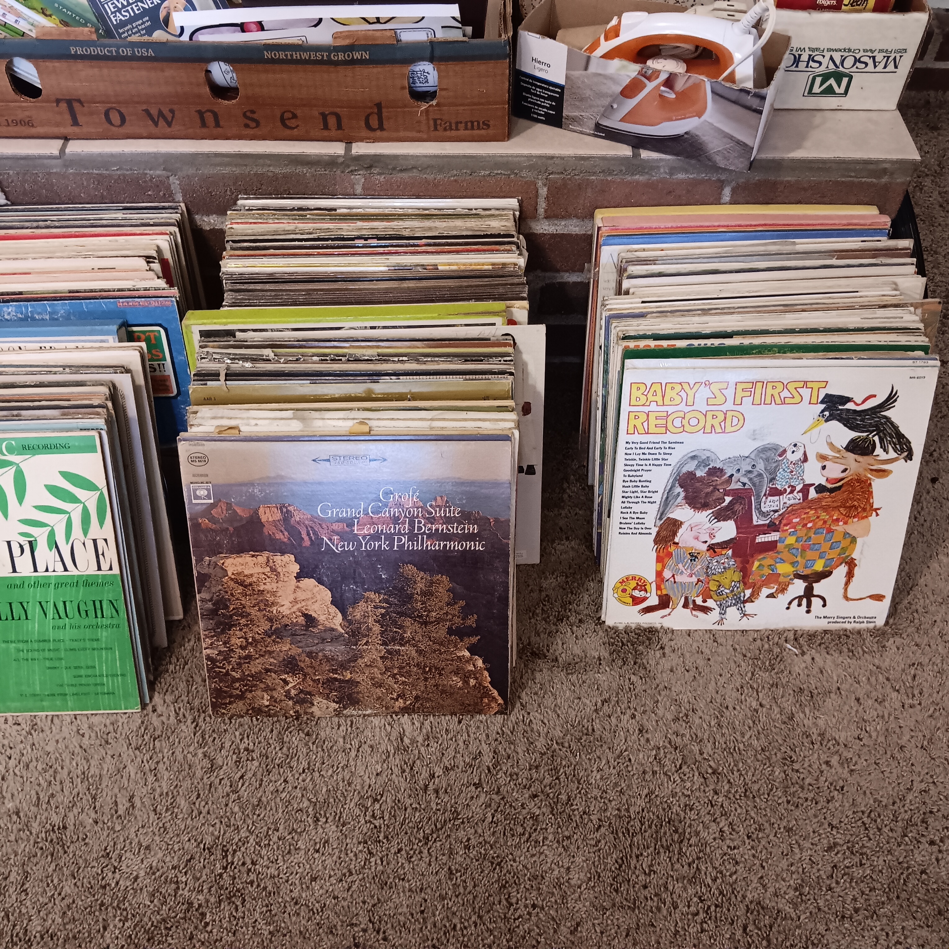 Tools, records, record players, plumbing, vintage lamps, furniture, household décor, vintage Tupperware, Pyrex, record cabinet, hand crank singer, men’s clothing, Honda mower, edger, vintage bicycles, an abundance of craft supplies, office supplies, quilts, Kirby vacuum, canning jars galore, washer/dryer ( electric), Revere pots and pans, cast iron, air compressor, like new bed we only just moved outside.